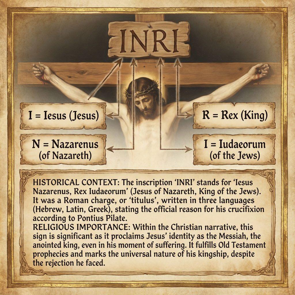 The letters INRI stand for Iesus Nazarenus Rex Iudaeorum, which is Latin for “Jesus of Nazareth, King of the Jews.” This phrase is rooted in the accounts of Jesus’ crucifixion found in all four Gospels: Matthew 27:37, Mark 15:26, Luke 23:38, and John 19:19-20. According to these texts, Pontius Pilate, the Roman governor, ordered a sign to be placed above Jesus on the cross. The sign declared the charge against Him, identifying who He was and why He was being executed. In Catholic crucifixes, INRI is often inscribed at the top to recall this moment. The use of Latin reflects its historical role as the official language of the Roman Empire and later the Church. This abbreviation has become a familiar symbol for Catholics worldwide. It serves as a reminder of Jesus’ identity and His sacrifice. The Catechism of the Catholic Church (CCC 213-214) discusses Christ’s titles, including His kingship, which ties to this inscription. In short, INRI captures a key detail of the crucifixion narrative.