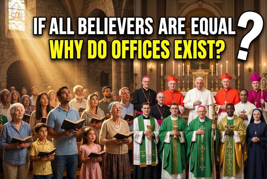 The coexistence of equality and offices in the Catholic Church reflects a profound theological vision of Christian community. All believers stand equal in baptismal dignity as children of God and members of Christ’s Body. This equality is real, not merely symbolic or theoretical. It means every baptized person has infinite worth, rights within the Church, and a call to holiness. No one is superior or inferior as a person because of their role or office. At the same time, offices exist within this equal community because Christ established them for the Church’s good. The ministerial priesthood, with its threefold office of teaching, sanctifying, and governing, serves the common priesthood of all the faithful. Ordained ministers are not a separate caste or elite group. They are servants who help all believers unfold their baptismal grace and live their Christian vocation fully. The offices exist for the sake of equality, ensuring that all believers have access to authentic teaching, valid sacraments, and effective pastoral care. Equality exists within the context of offices, as all believers work together in diverse roles for the common mission.