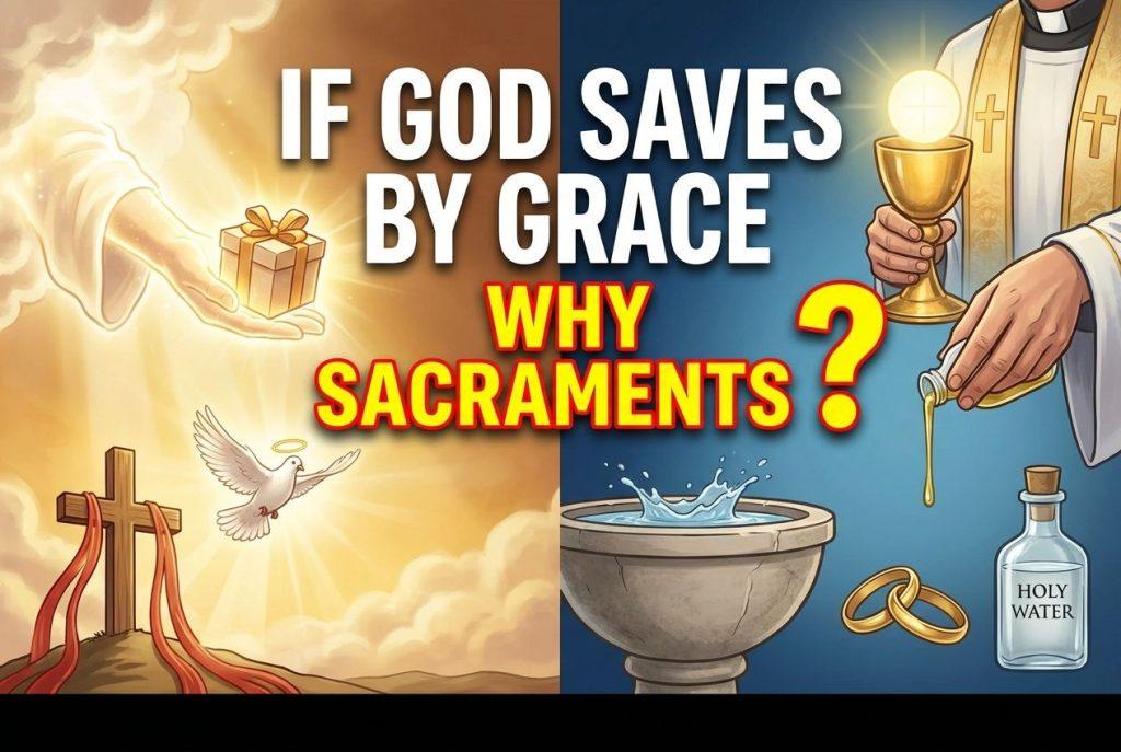 - The Catholic Church teaches that God saves by grace alone, yet the sacraments are the ordinary means through which this grace reaches believers.