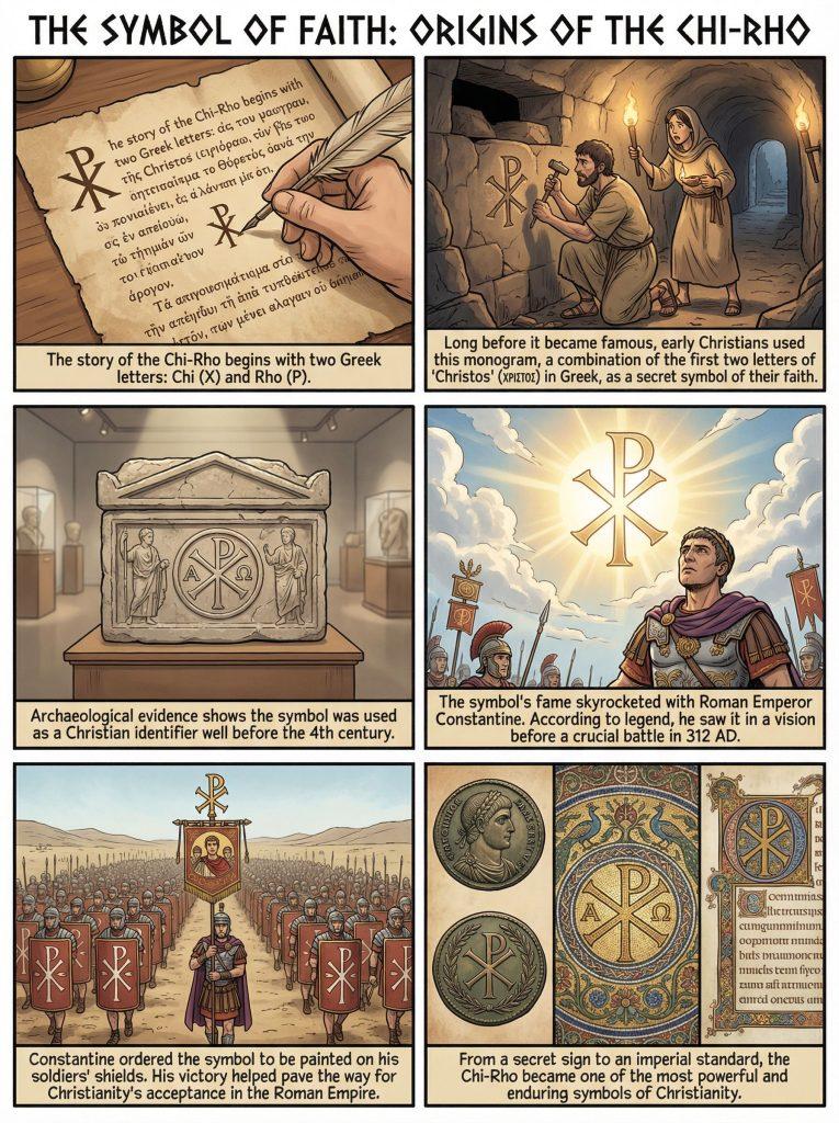 Early Christian art frequently featured the Chi-Rho as a central motif. In the catacombs of Rome, archaeologists have found it etched into stone alongside other Christian symbols like the fish or the cross. Its presence in these underground burial sites highlights its role as a sign of hope in eternal life. The symbol often appeared encircled by a wreath, symbolizing victory, a theme tied to Christ’s resurrection. By the 4th century, as Christianity became legal under Constantine, the Chi-Rho adorned public buildings and coins. Artists used it to mark sacred spaces, blending Roman artistic styles with Christian meaning. The Catholic Church later adopted it into its broader artistic tradition, ensuring its longevity. Scholars point out that its design allowed for easy recognition, even among the illiterate. This accessibility made it a powerful tool for spreading the Gospel. Today, it remains a link to the Church’s early visual heritage.
