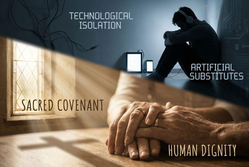 The human person is created for relationship, not for isolation. God himself exists as a communion of three divine persons, and humans made in his image are called to live in communion with others. No one can live wholly within himself; we need relationships with other persons to discover who we truly are and to develop our capacities for love (CCC 1878). This relational nature extends to sexuality, which is ordered toward the union of persons, not merely toward individual pleasure or satisfaction. Authentic sexual love involves vulnerability, reciprocity, and the willingness to be known and to know another in the most intimate way. Such love requires accepting the other as they truly are, with their limitations, moods, and needs, rather than relating to an idealized fantasy or a customizable image. The difficulty inherent in human relationships, the need to compromise and communicate and work through conflicts, forms an essential part of human growth and maturity. When people attempt to replace authentic relationships with artificial substitutes that eliminate these challenges, they cut themselves off from the very experiences that enable human flourishing. Technology can facilitate genuine human connection when used properly, enabling communication across distances and helping people maintain relationships. However, when technology becomes a substitute for rather than a tool for human relationship, it isolates rather than connects. The rise of artificial intelligence and robotics poses particular challenges because these technologies can simulate aspects of human interaction without actually providing authentic relationship. A machine may respond to inputs in seemingly personal ways, but it cannot truly know or love or commit itself to another. No algorithm can replicate the mystery of human personhood or the freedom that enables genuine love.